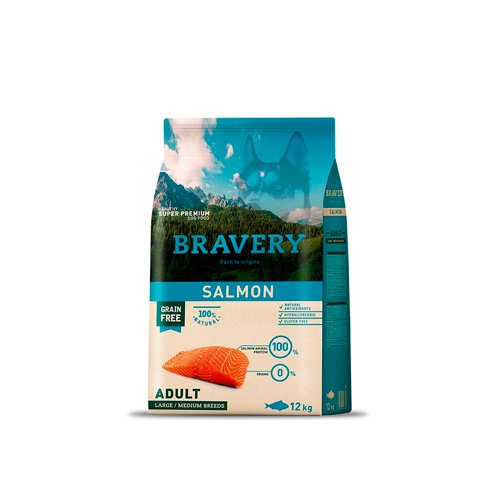 Salmon Adult de BRAVERY® Es un alimento con salmón para perros adultos de razas medianas y grandes. Libre de grano y cereales, además, de ser monoproteíco, con salmón siempre como primer ingrediente y enriquecido con antioxidantes hipoalergénicos 100% naturales. Es una receta que se encuentra un elevado contenido de proteínas, alta digestibilidad y palatabilidad, ideal para razas de perros adultos medianos y grandes.