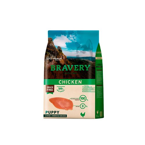 Chicken Mini Puppy de BRAVERY® Es un alimento con pollo para cachorros de razas pequeñas. Libre de grano y cereales, además, de ser monoproteíco, con pollo siempre como primer ingrediente y enriquecido con antioxidantes hipoalergénicos 100% naturales. Es una receta con un elevado contenido de proteínas, alta digestibilidad y palatabilidad, ideal para razas de cachorros pequeños.