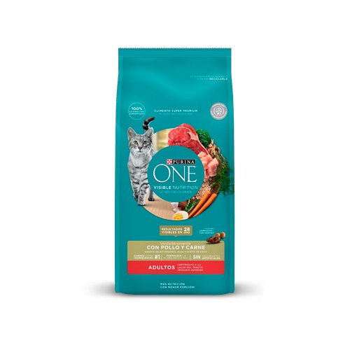 Alimento seco para gatos adultos PURINA® ONE® con Pollo y Carne. Con carnes como ingredientes #1, granos seleccionados, alga como fuente de Omega 3 y aceite de coco como fuente alternativa de energía. Con probióticos naturales que fortalecen la flora intestinal y garantizan una mejor digestión y heces más firmes. Este alimento contribuye a la salud del tracto urinario inferior de tu gato. Formulado por nutricionistas, PURINA® ONE®.